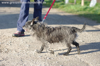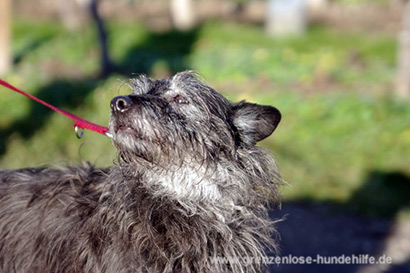 Urgo ist ein ca. 12jähriger kleiner niedlicher grauer Wuschel. Ein Terriermix Rüde, der für sein Alter noch recht fit ist.
