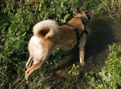Sonst traute er sich ja immer nur bis zum Bauch und alle Lockversuche brachten nichts, aber eines Tages sprang er todesmutig seinem Stock hinterher (in einen Entengrütze-Tümpel mit Matschboden, nachdem er jeden Fluss und Badesee verschmäht hatte...).