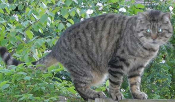 EKH-Kater, mindestens 8 - 10 Jahre alt, braun-beige getigert, braune Nase; wegen einer Augenverletzung sieht er aus, als ob er grimmig guckt; neugierig, gemütlicher Brummbär; kastriert und geimpft. Eventuell trägt er noch sein grünes Halsband.