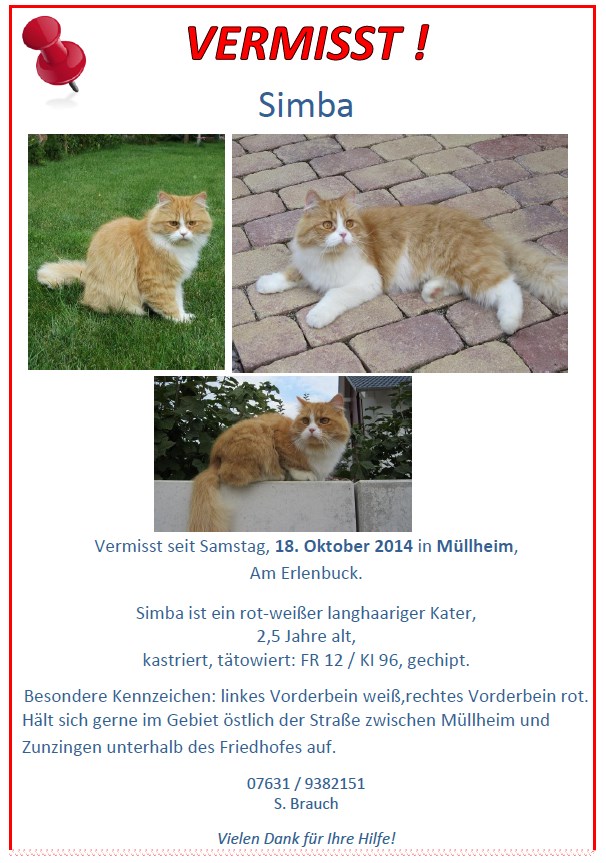Kater Simba, vermisst seit 18. Oktober 2014 in Müllheim