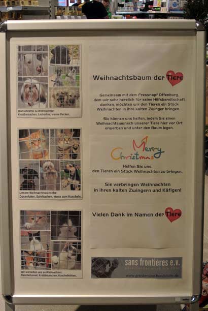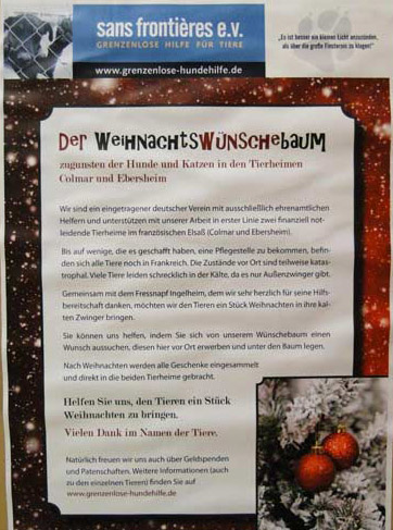 Auch in diesem Jahr freuen wir uns wieder sehr, dass die beiden Märkte in Ingelheim und Offenburg mit Weihnachtsbäumen zu Gunsten unserer Schützlinge geschmückt sind!