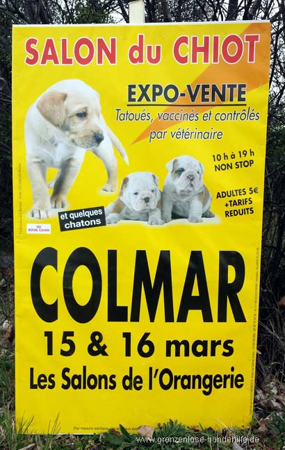 Als ich Samstag nach Colmar fuhr, da waren sie wieder, überall diese schrecklichen gelben Schilder "Welpenmesse, Samstag und Sonntag, Non-stop Verkauf von 10:00 Uhr bis 19:00Uhr". Es lies mir