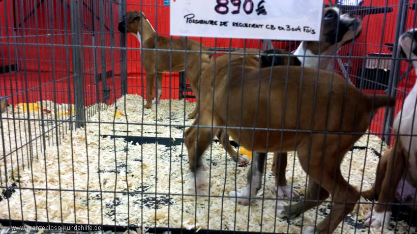 diesmal keine Ruhe mehr und so fuhr ich Sonntag morgen mit großem Magengrummeln, ob ich das durchstehen würde zu dieser fürchterlichen Veranstaltung, die in Frankreich leider völlig normal ist und in den Städten mehrmals jährlich stattfindet. Und da stand ich dann vor der Halle, zwischen Transportern mit vorwiegend Kennzeichen aus Südfrankreich. Dort sind die großen Zuchtstationen in Frankreich beheimatet, in der zumeist zwischen 500 und 800 Zuchthündinnen in engen Boxen ein grausames seelenloses Leben führen und einen Wurf nach dem anderen produzieren. Täglich verlassen dort LKW´s mit zig Welpen diese Stationen, die dann in ganz Frankreich an Zoohandlungen geliefert werden, oder eben auf diesen schrecklichen Messen verkauft werden.