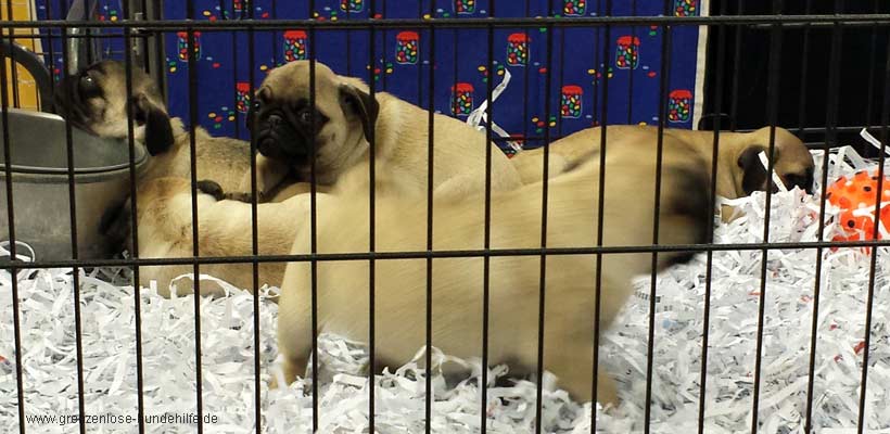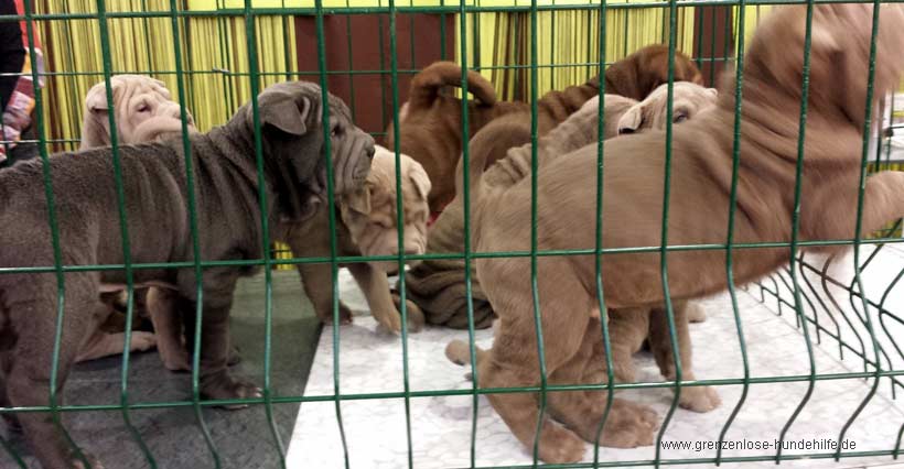 Mein Herz war schwer und ich ging hinein, zusammen mit einer Familie mit kleinen Kindern. Und da stand ich dann, schockiert, es wimmerte überall, laute Menschenstimmen, schrilles Kindergeschrei, Kinder, die an die Käfige mit den Händen klatschen, Welpen, die verängstigt da sitzen...Hundekinder aller Rassen. Die Kinder der besagten Familie rannten zum ersten Käfig und fanden diese Möpse so toll.. davon möchten sie Einen, unbedingt. Ich blieb stehen, hörte zu und dachte mir, sie werden wohl jetzt keinen Hund nach den Wünschen der kleinen Kinder kaufen? Gesagt, getan.. ca. 10 Minuten später sah ich sie an einem Stand mit Sharpei´s, die Kinder suchten sich gerade einen Sharpei aus, die Verträge wurden geschrieben und schon Minuten später verliesen sie die Messe mit einem Sharpei unter dem Arm, der dann noch an den Verkaufsständen im Vorraum ausgestattet wurde. Gekauft wurde kein Hund, sondern ein neues Spielzeug für die Kinder. Ein unüberlegter gekaufter Gegenstand, der gerademal 1.590 Euro gekostet hat!!