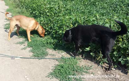 Er beschnüffelte sie kurz und dann liefen beide friedlich zusammen mit. |