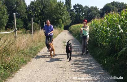 Es war kein Problem, ihn aus dem Zwinger hinaus zu führen. Auch draußen lief er artig mit, kam auf „ici“ heran, setzte sich bei „assis“ brav hin und nahm sehr lieb die Leckerchen an. Die kann Vince wirklich vertragen, denn er ist leider zu dünn. Anders als die neue Hündin, die uns begleitete … mit der Vince überhaupt kein Problem hatte.