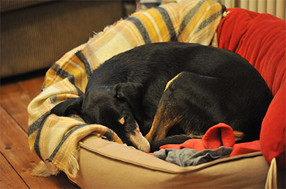 Yoki ist ein ganz lieber Kerl, er liegt tagsüber ruhig im Körbchen und wartet geduldig bis seine Gassigeher kommen.