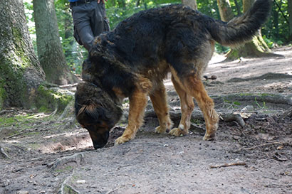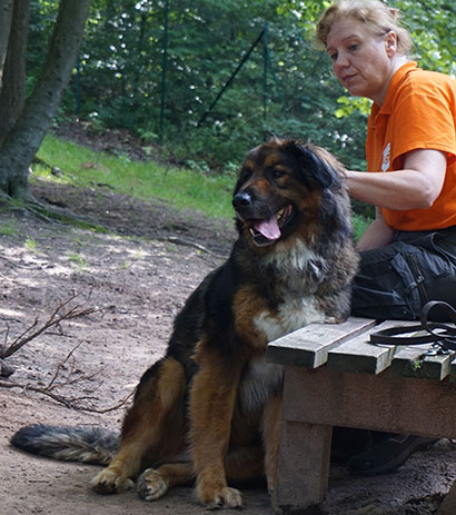 Artgenossen begegnet er neutral und Fußgänger oder Radfahrer sind kein Problem für ihn.